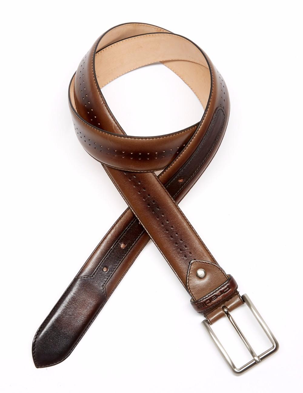 Cinturón en acabado napa. Detalle de difuminados vintage en picados centrales y puntera lisa, pasantín con grabado Prada. Hebilla cuadrada en plateado.