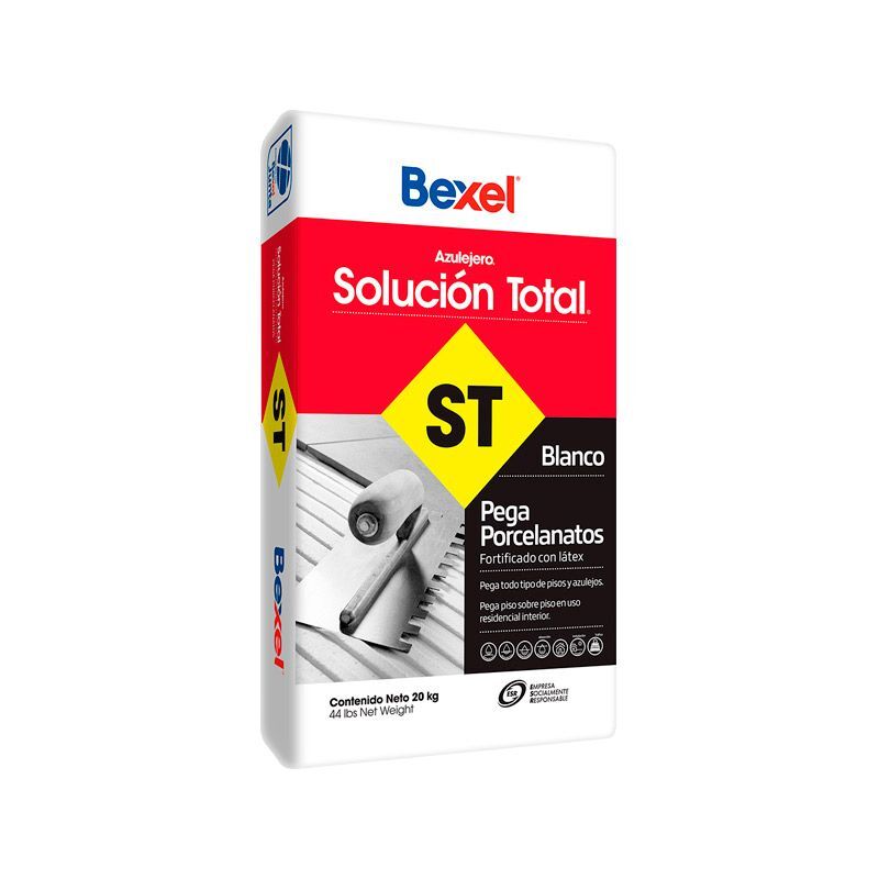 El Azulejero Solución Total adhesivo Bexel 20 Kg es un adhesivo fortificado con látex en polvo, especial para instalar recubrimientos porcelánicos y todo tipo de revestimientos pétreos y cerámicos de ALTA, MEDIA y BAJA absorción de agua, en plafones, muros y pisos en áreas interiores o exteriores de tráfico intenso.