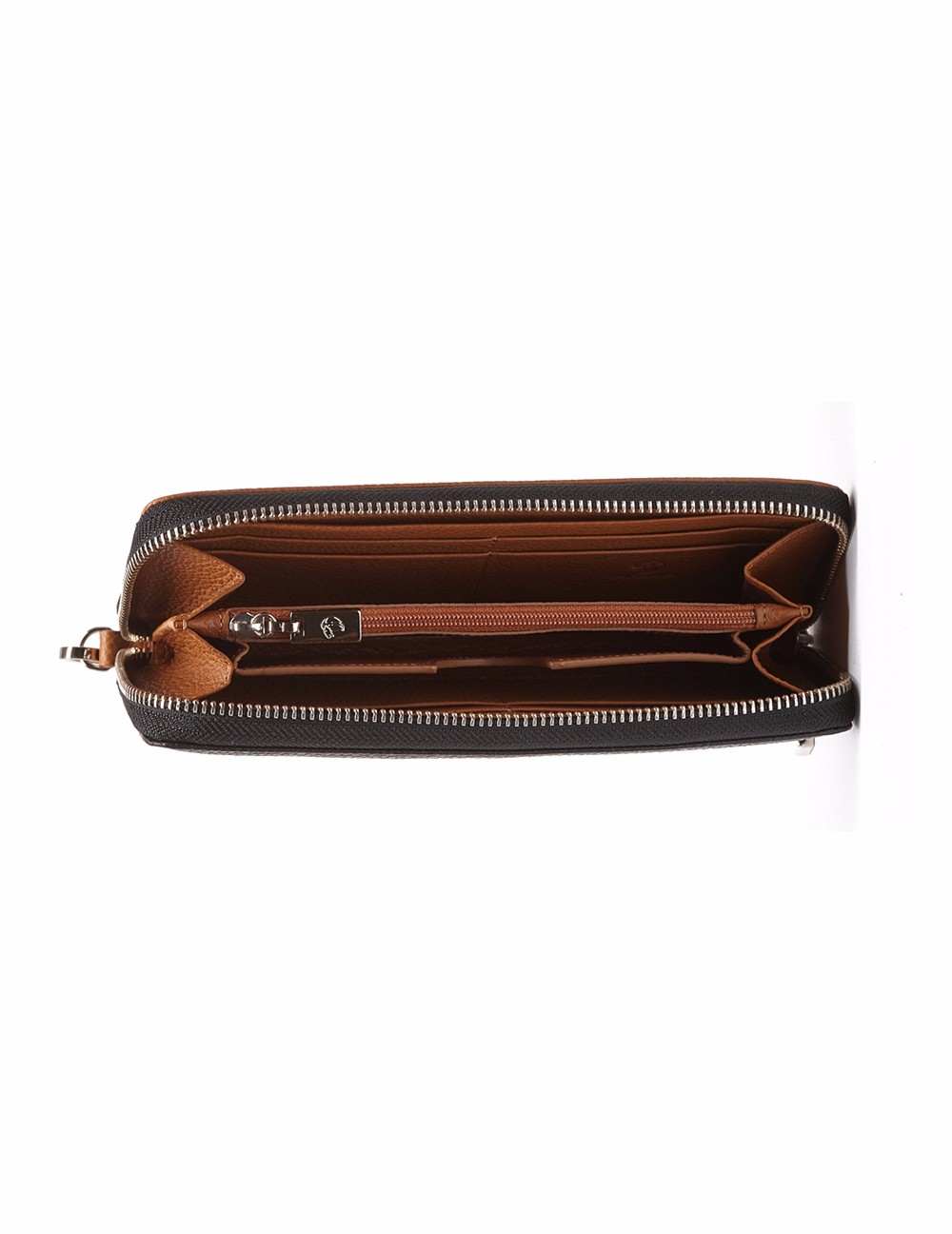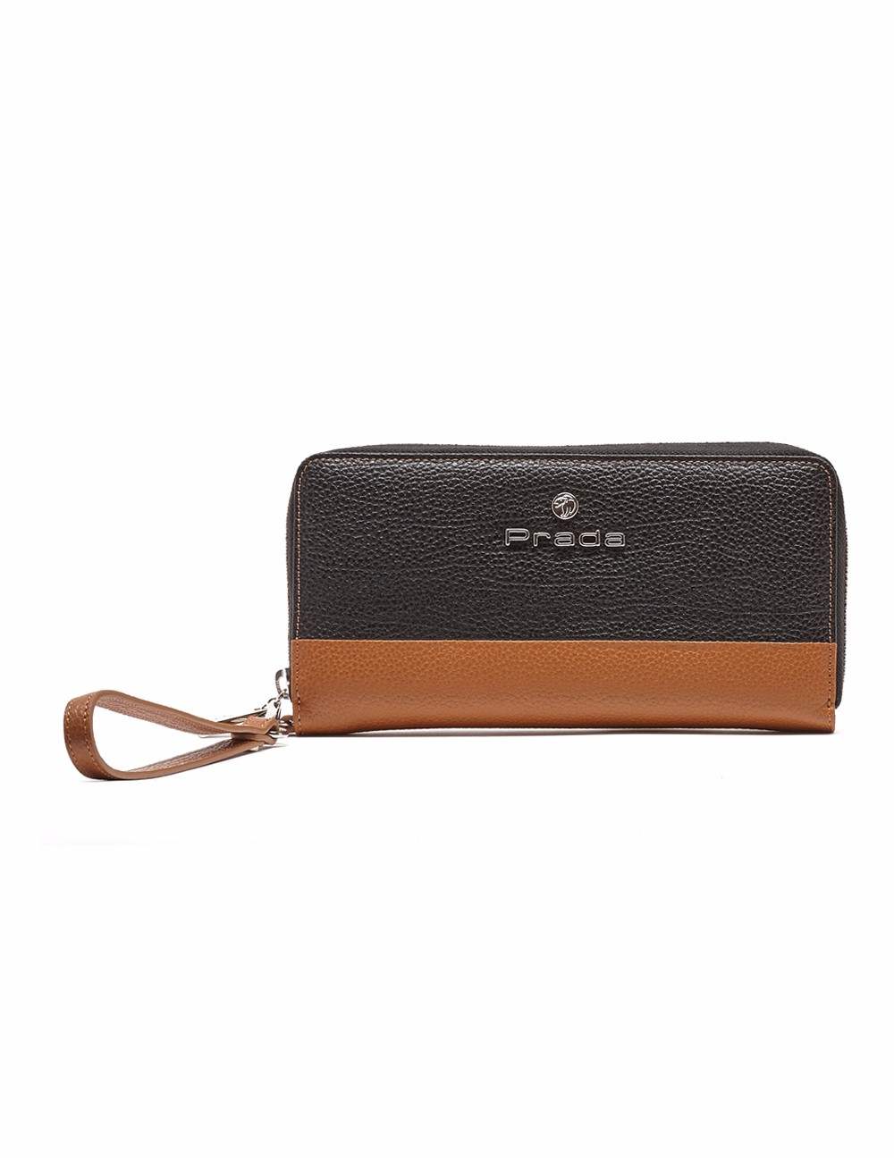 Monedero en acabado piel grabado en saffiano. Detalle de cremallera perimetral, asa de mano tirador, cuenta con tarjeteros, botón"león Prada" en niquel.