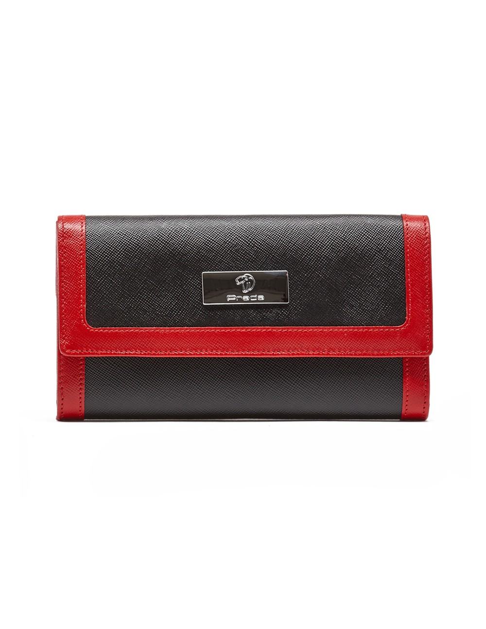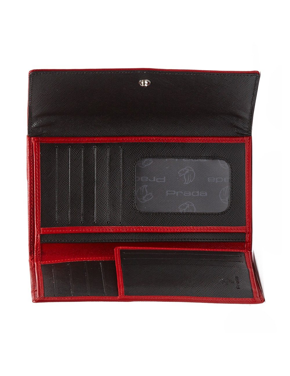 Monedero mediano solapa en acabado saffiano. Detalle de bies en contraste, placa "león Prada" en frontal. Interiores en mismo acabado y vivos en contraste, cuenta con tarjeteros y Monedero exterior con cremallera. Fornituras niquel.