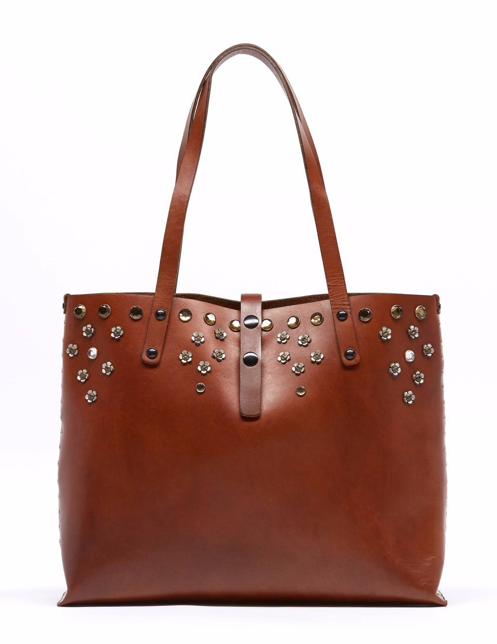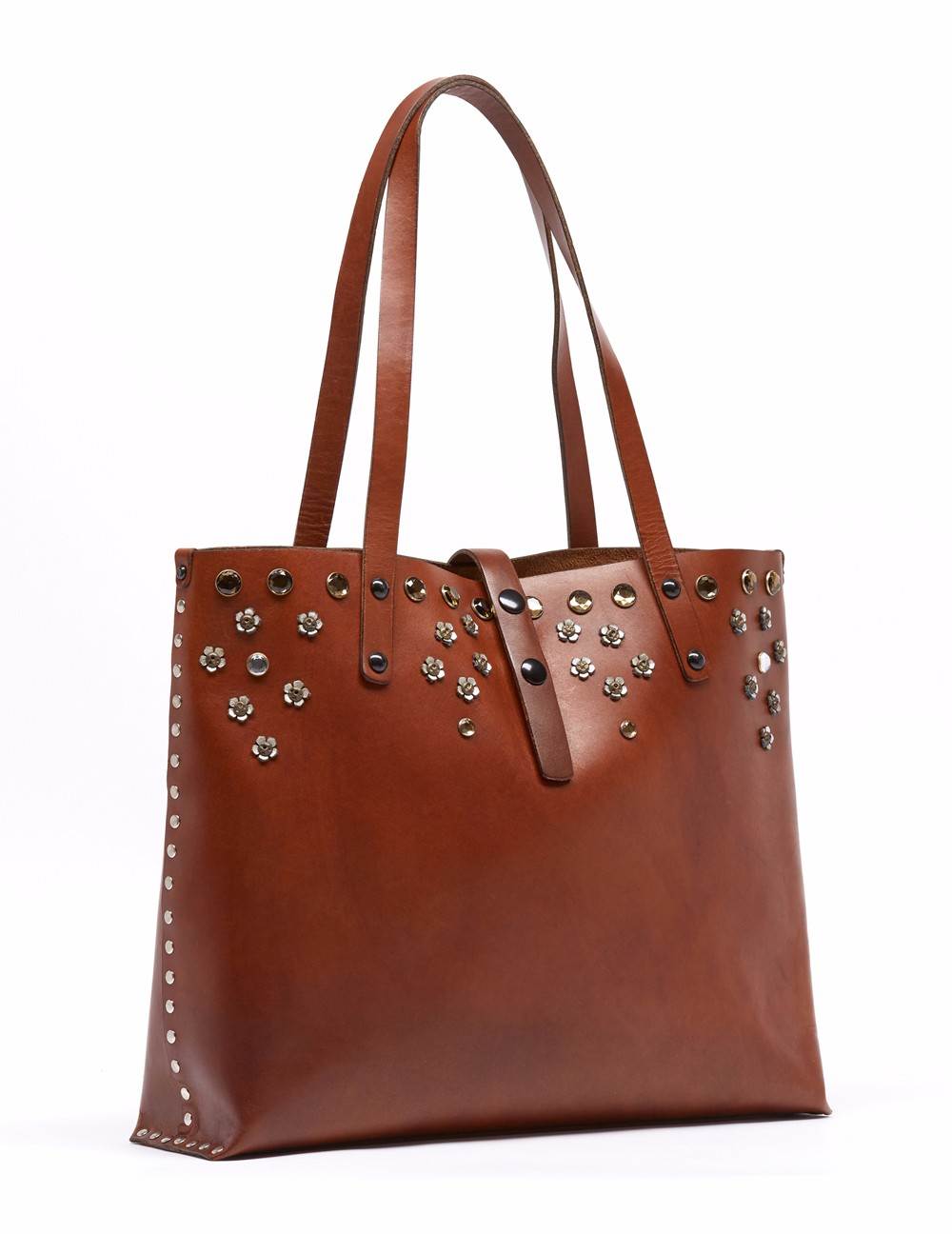 Bolso shoppingbag en acabado piel vaqueta. Detalle de tachas en flor y cuentas de strass en la parte superior del bolso, uniones con detalles de tachas. Bolsos utilitarios internos. Asa hombro en el mismo acabado. Herrajes y fornituras en oro viejo estilo vintage, así como grabado a fuego león Prada. Medidas: 38x30x10 cm