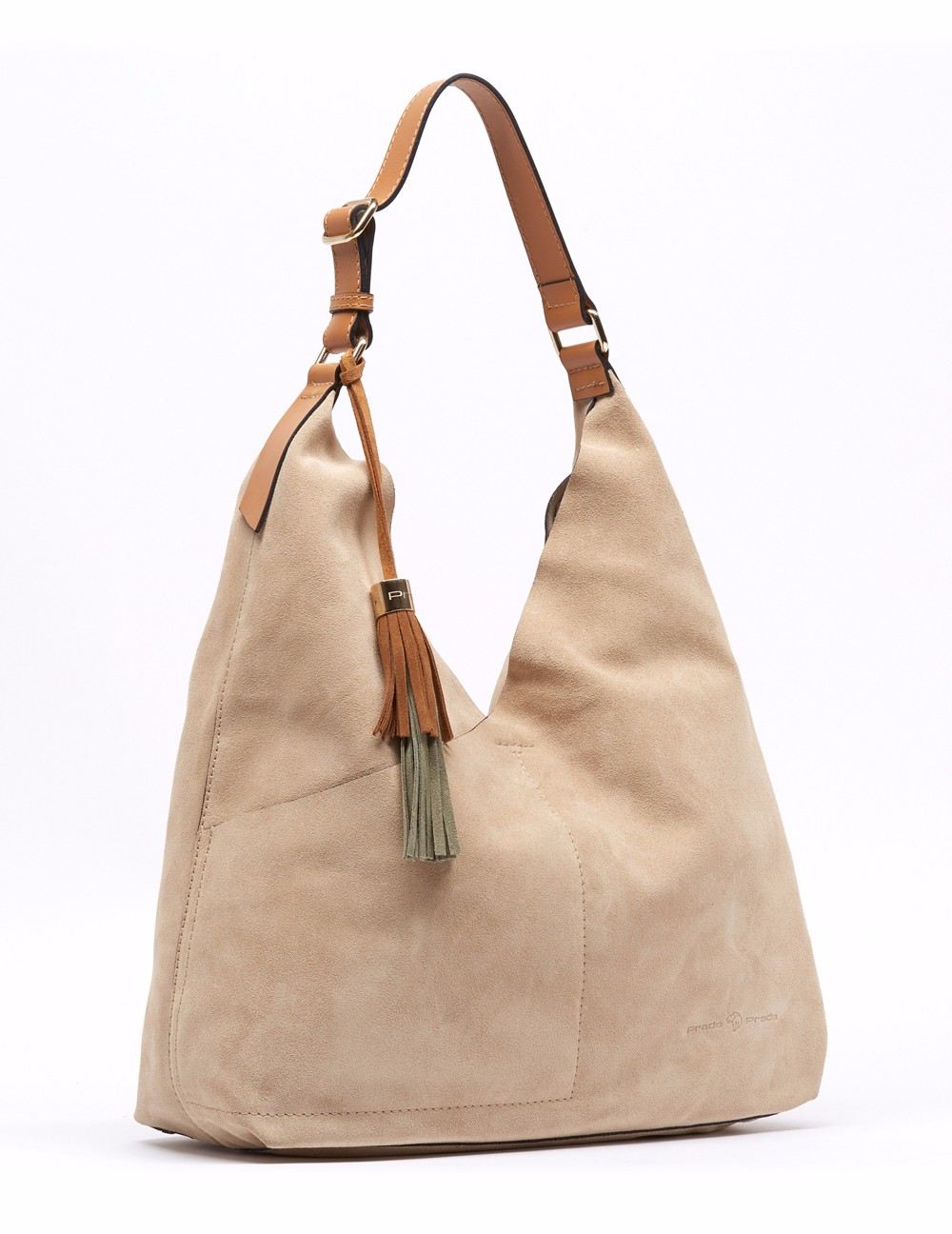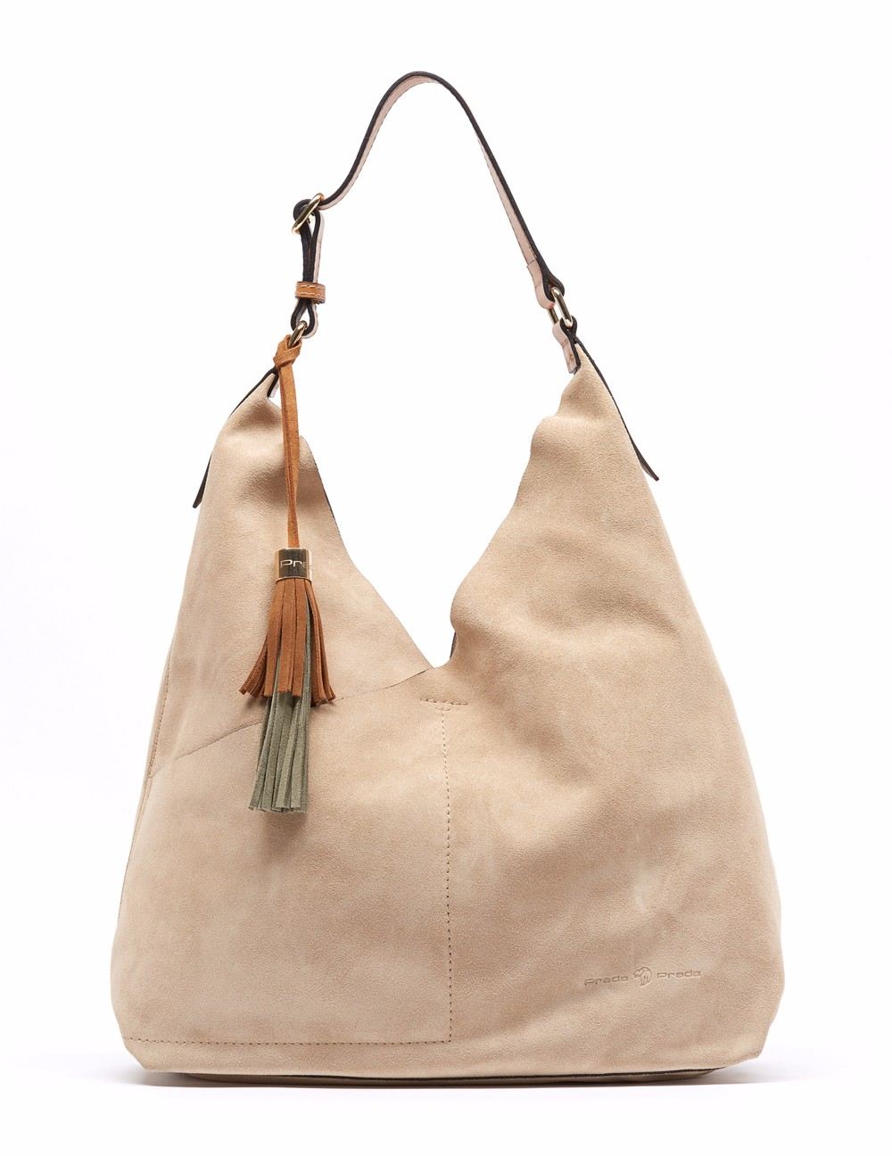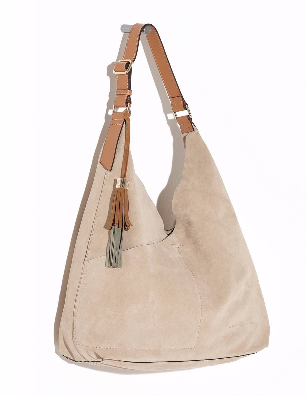 Bolso hobo en acabado ante metálico. Detalle de acabado metálico craquelado estilo "vintage", asa, y pompón bicolor frontal de piel en contraste. Bolsos utilitarios internos. Asa de hombro con pespuntes al color. Herrajes y fornituras en dorado, así como insignia león Prada. Medidas: 34x43x13 cm