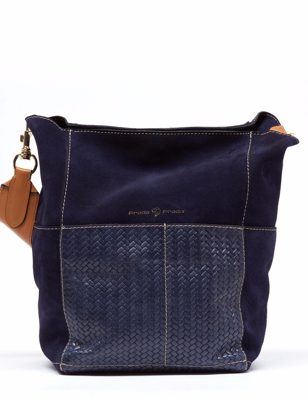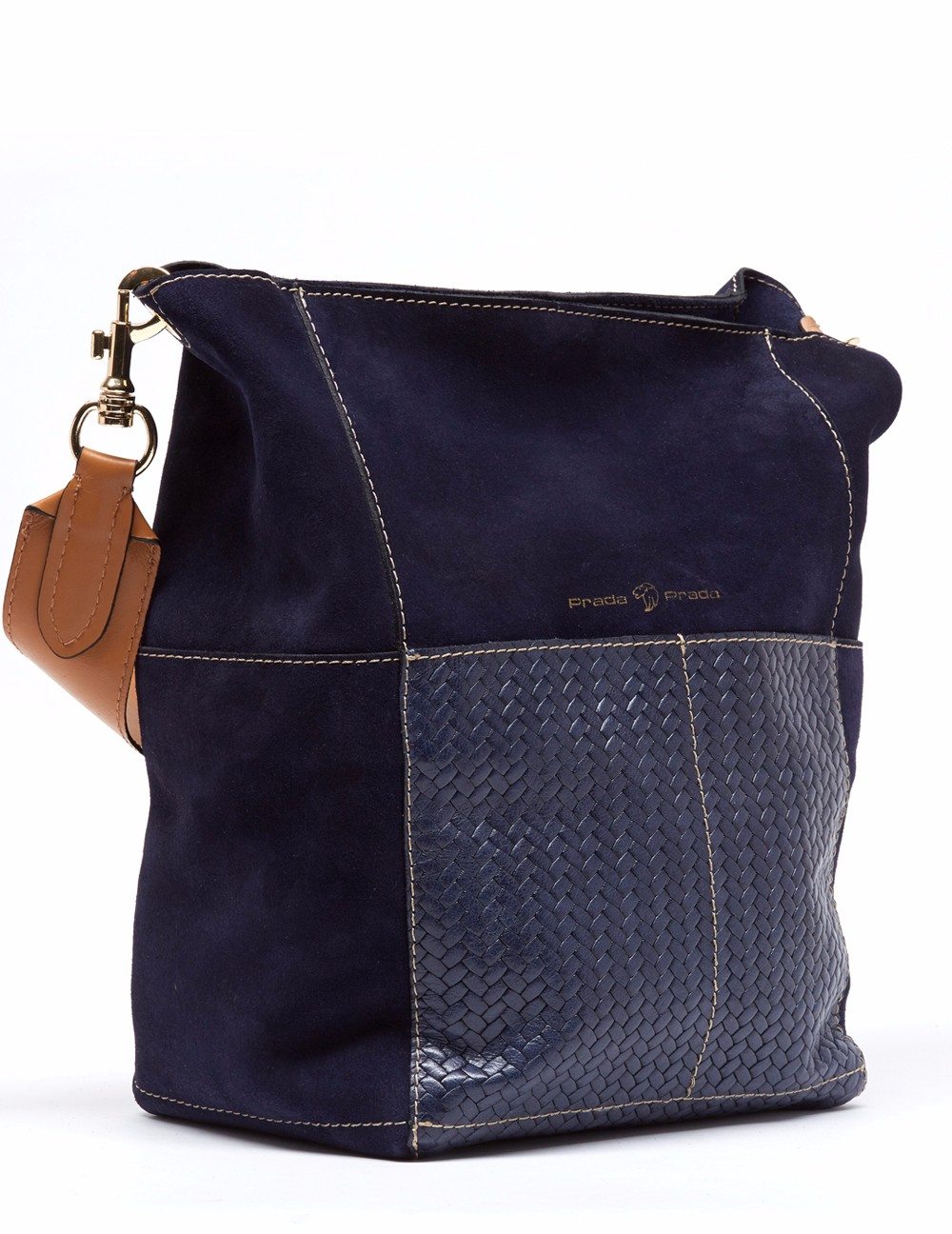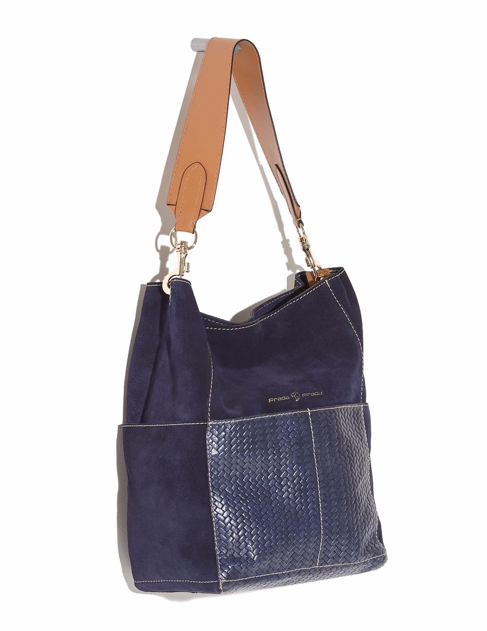 Bolso shopper en acabado ante. Detalle de bolso frontal con grabado trigo en piel napa, en vista frontal, asa de piel en contraste. Bolsos utilitarios internos, bolso utilitario con cremallera en la parte posterior. Asa de hombro con pespuntes al color. Herrajes y fornituras en dorado, así como grabado a fuego y timbrado en plateado. Medidas: 37x33x16 cm.