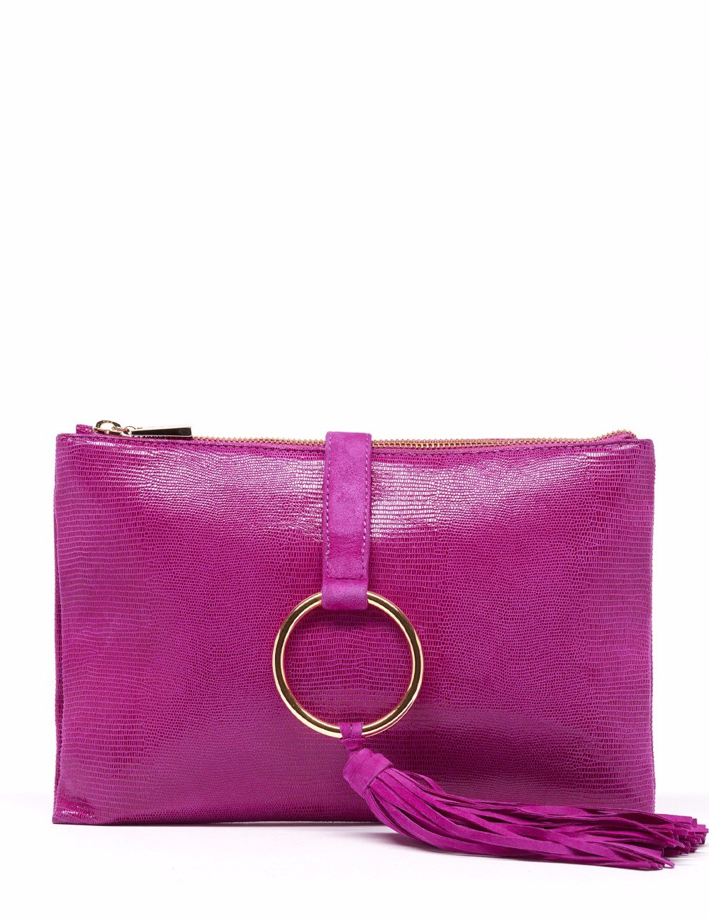 Bolso clutch en acabado ante. Detalle de grabado tejus en vistas principales con solapa delgada y adorno circular con pompón en ante al tono. Bolsos utilitarios internos y forro personalizado león Prada. Herrajes y fornituras en dorado, así como placa león Prada. Medidas: 27.5x19x2 cm