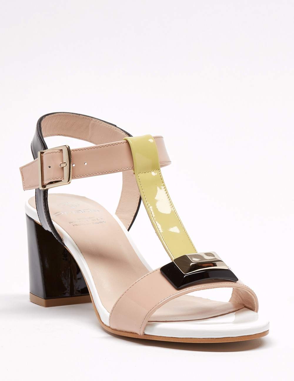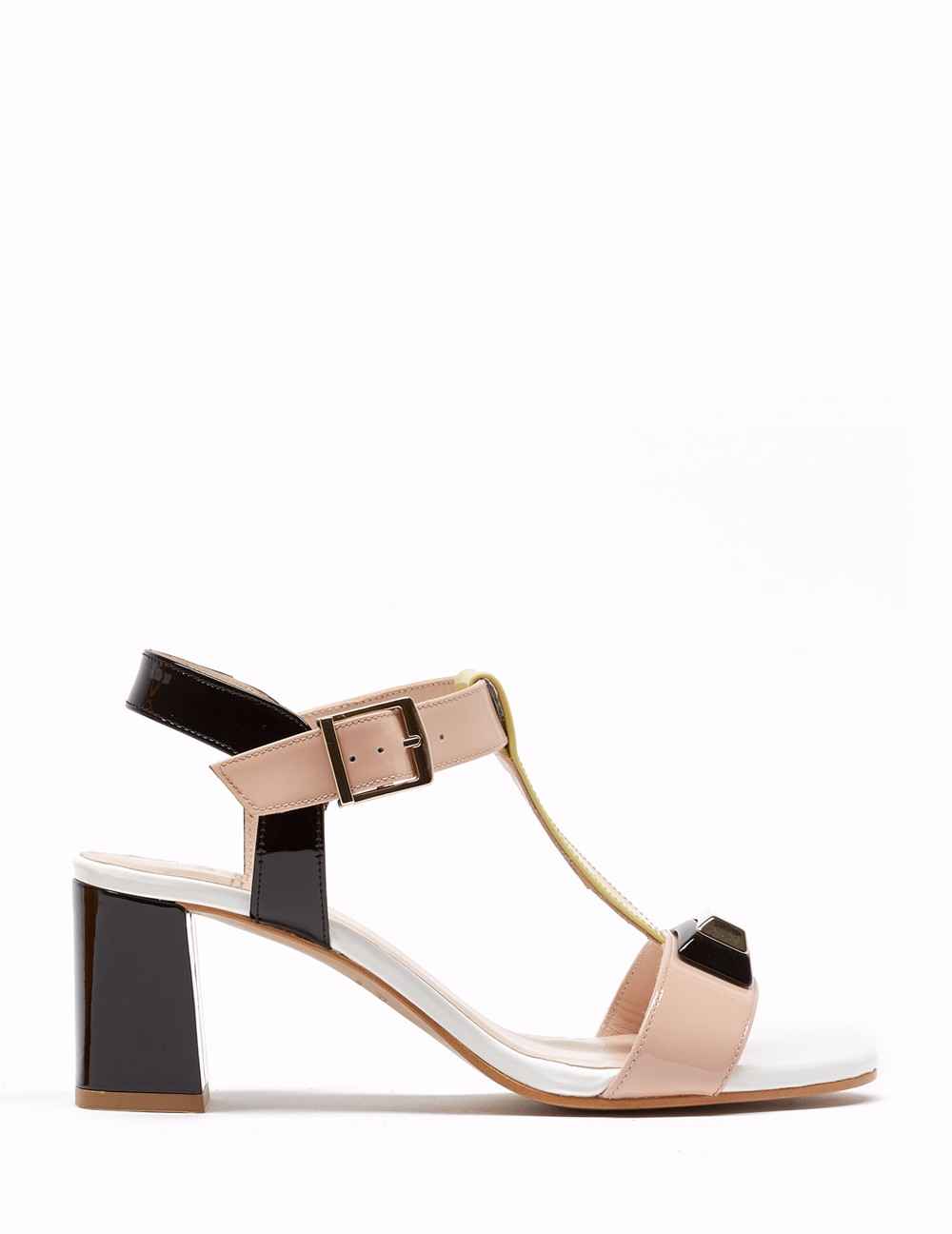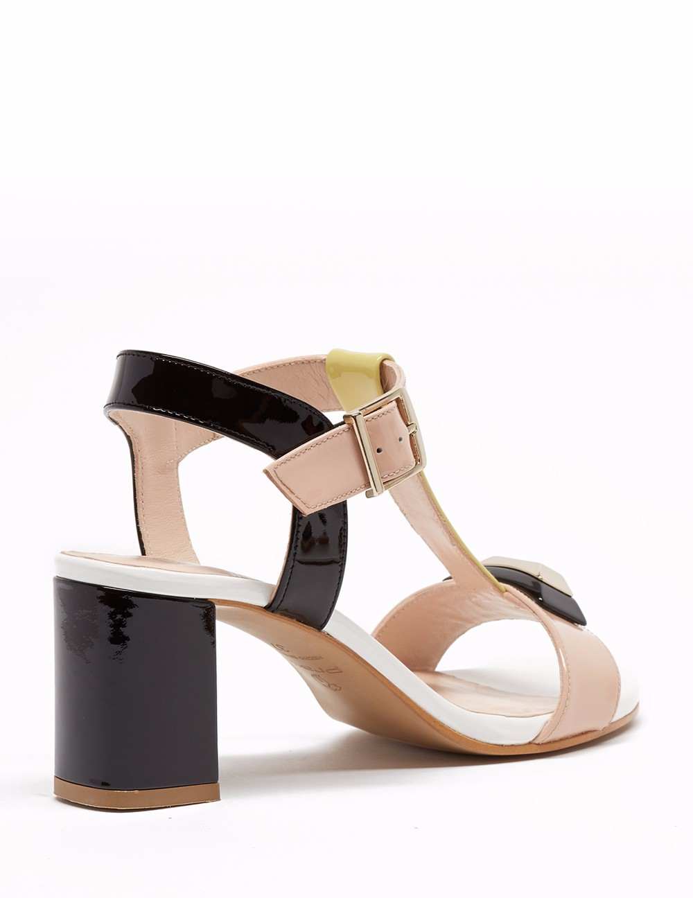Sandalia en acabado charol. Detalle de pulsera tipo "T", en tonalidades pastel y contrastes negros, adorno en pala tipo maxi tacha plana y pulsera en tobillo que facilita el calce. Tacón cuadrado de 5.6 cm, forrado en charol.