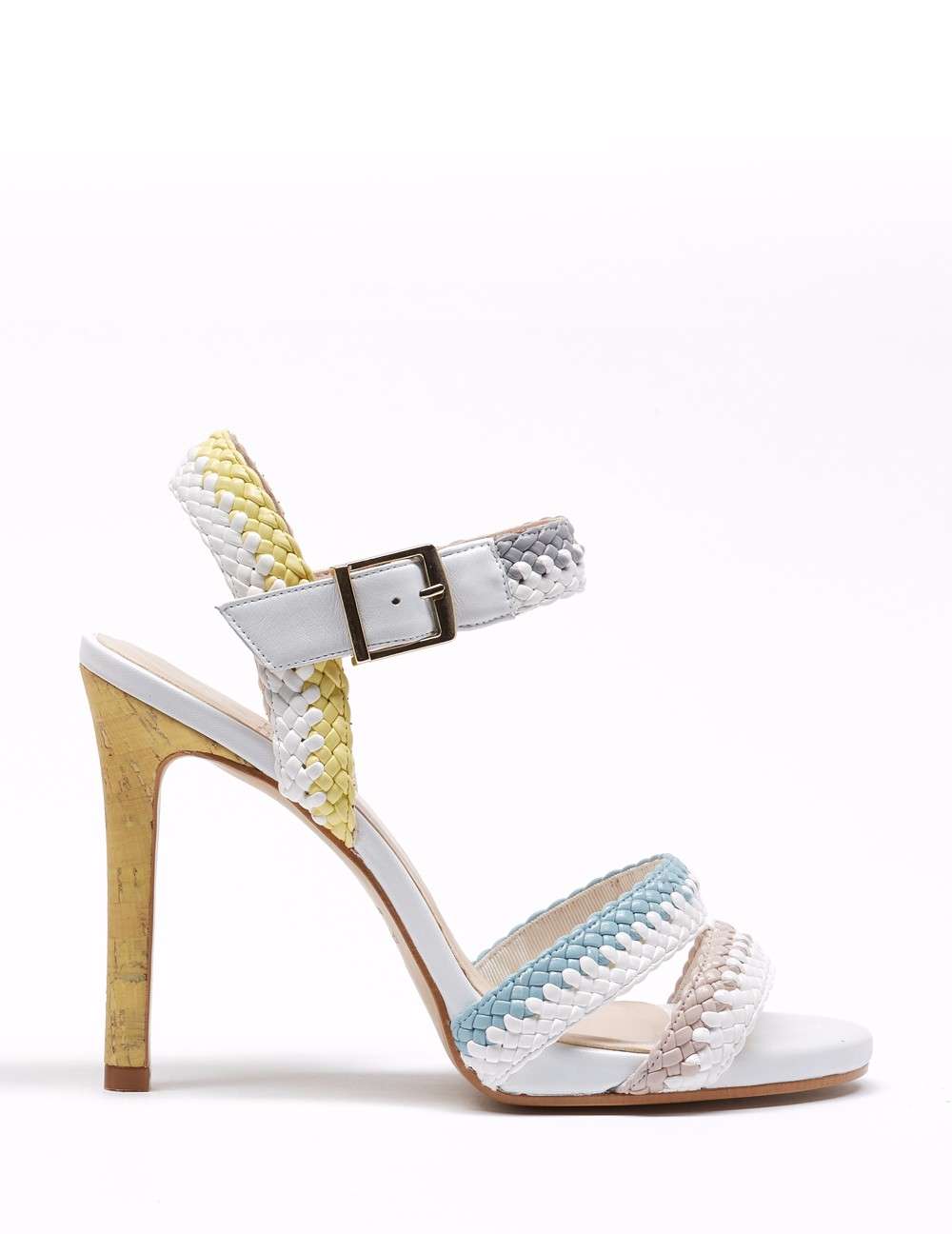 Sandalia en acabado piel napa. Detalle de trenzado doble en tonos pastel y trenza como pulsera en el tobillo que facilita el calce. Herrajes y fornituras en dorado. Tacón de 10 cm, forrado en corcho.