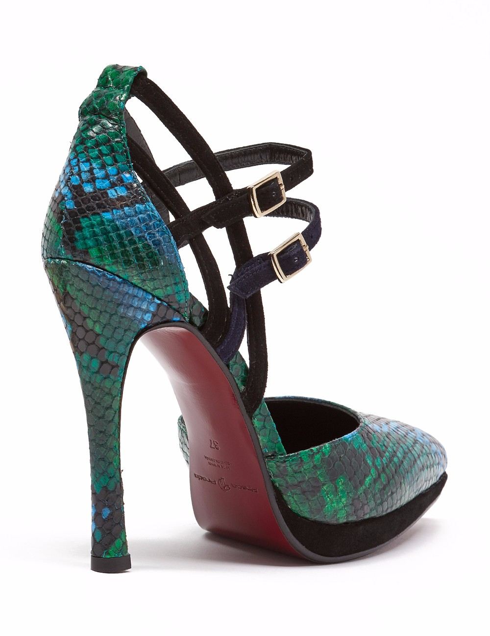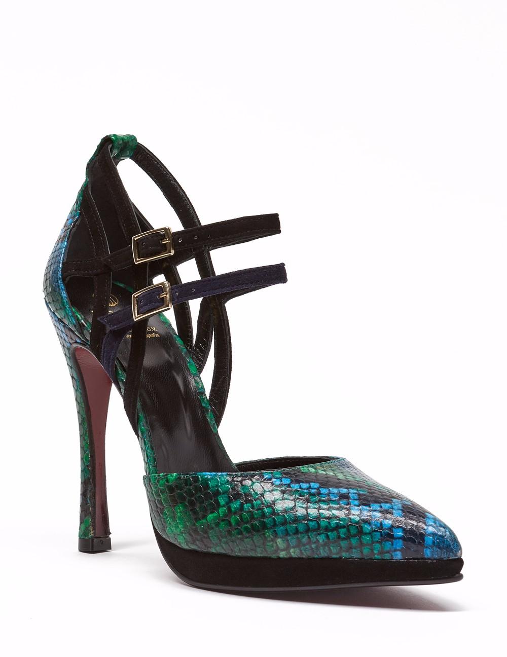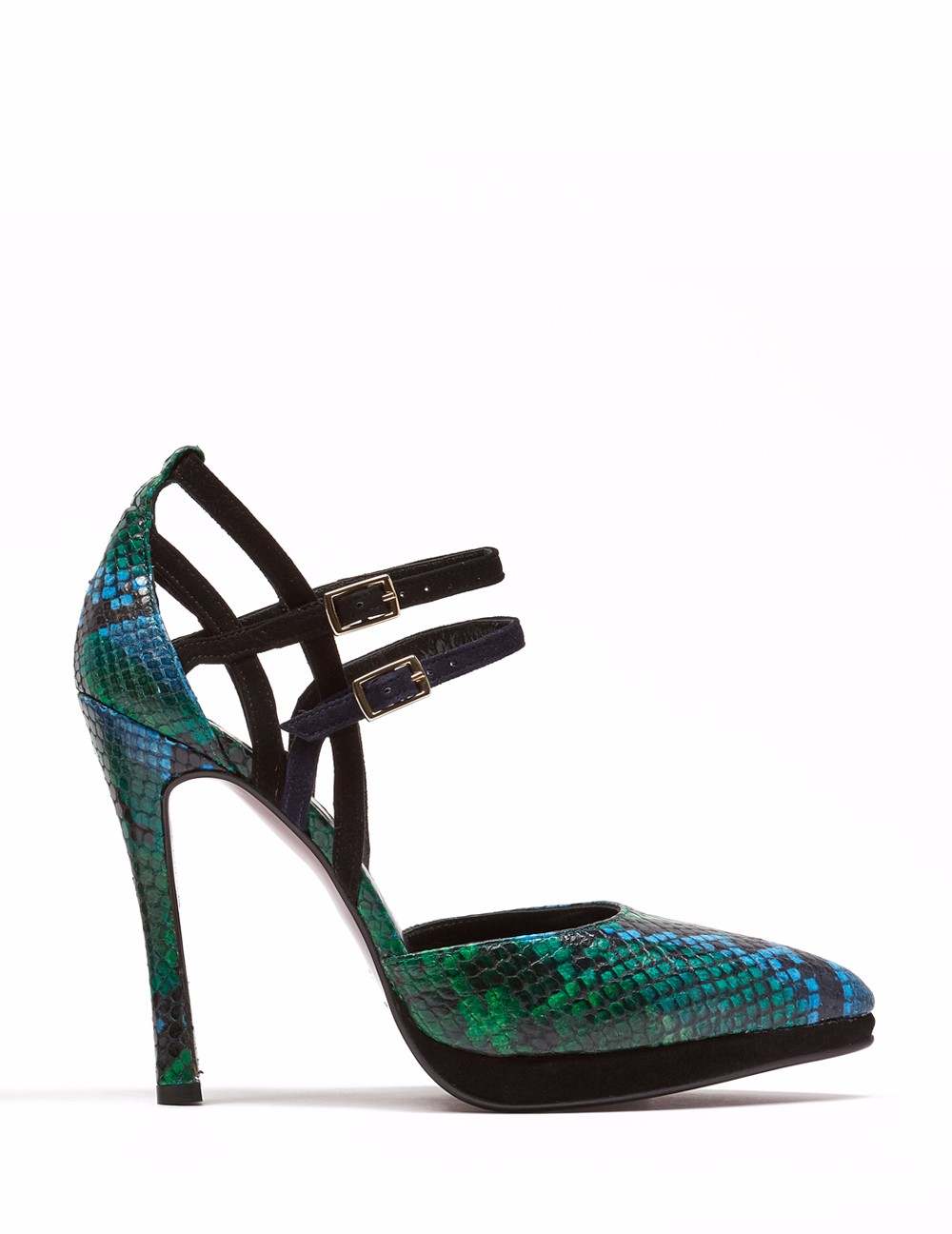 Zapatilla en grabado serpiente. Detalle de grabado serpiente en pala, contrafuerte y tacón, así como pulseras dobles y arqueadas en talón, y punta almendrada. Tacón stiletto de 11 cm.