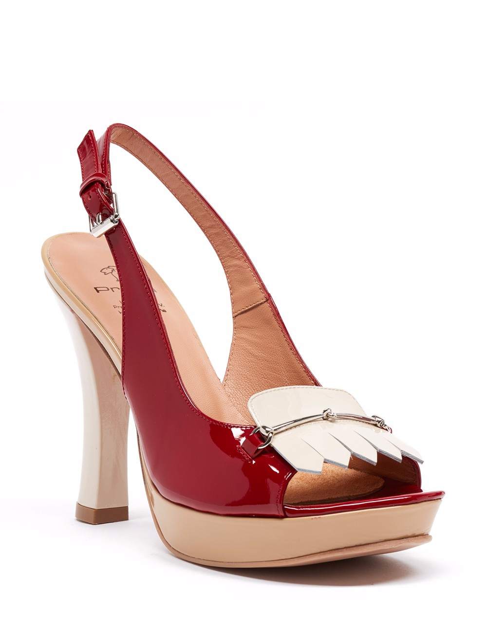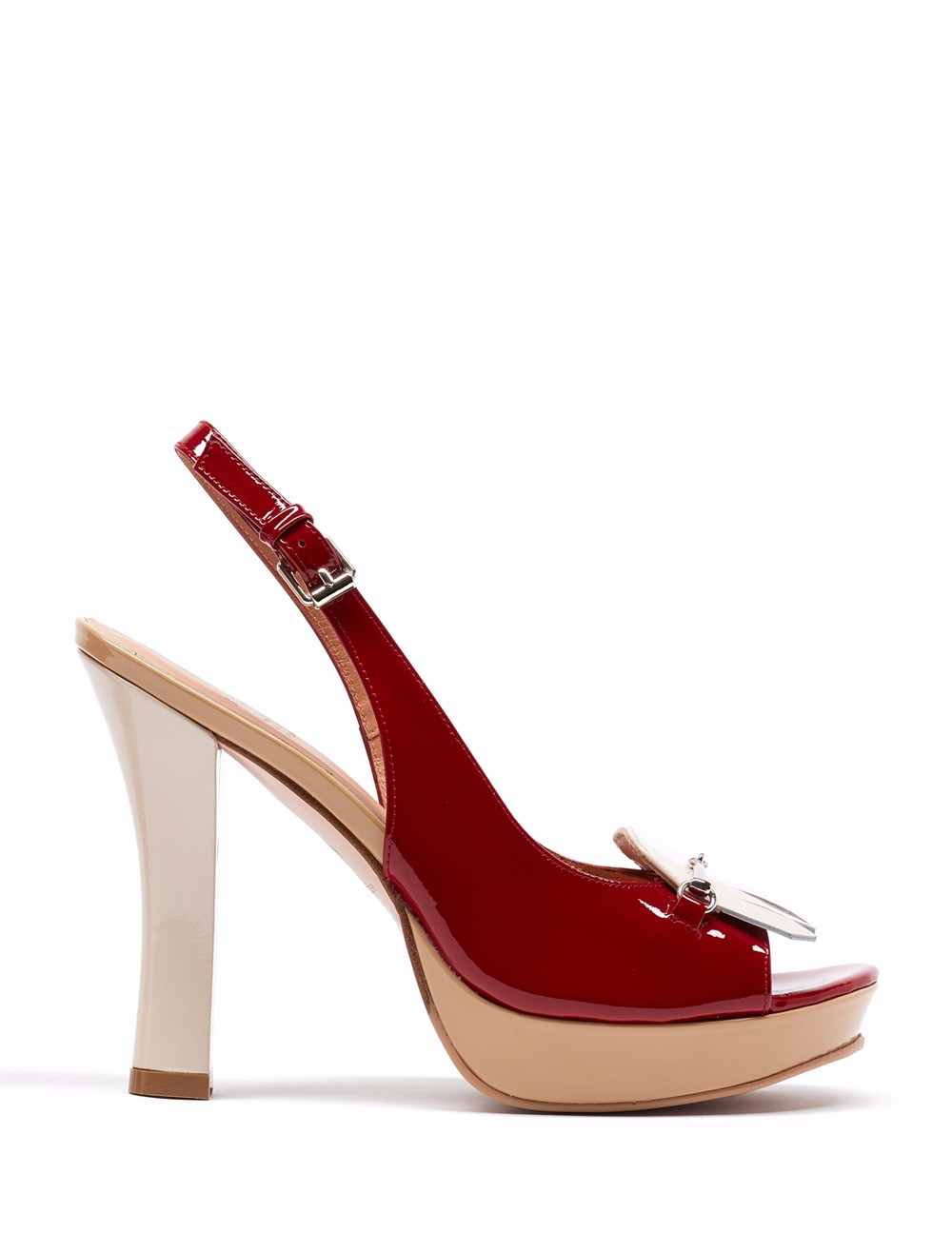 Peep toe destalonado en acabado charol. Detalle de tres colores diferentes cañas, flecos de pala y tacón. Tacón campana de 10 cm, y plataforma de 2 cm.