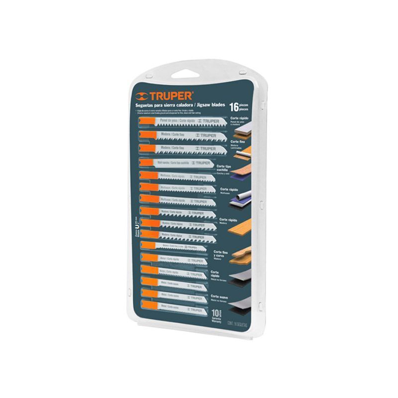 El juego de seguetas_ con 16 pzs_ marca Truper_ cuenta con seguetas para madera_ fabricadas en acero al cromo y seguetas para metales fabricadas en acero alta velocidad.