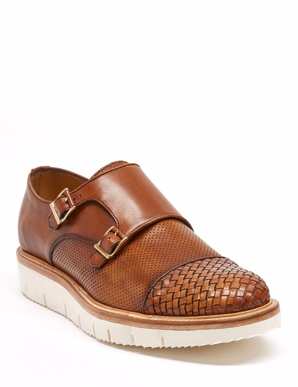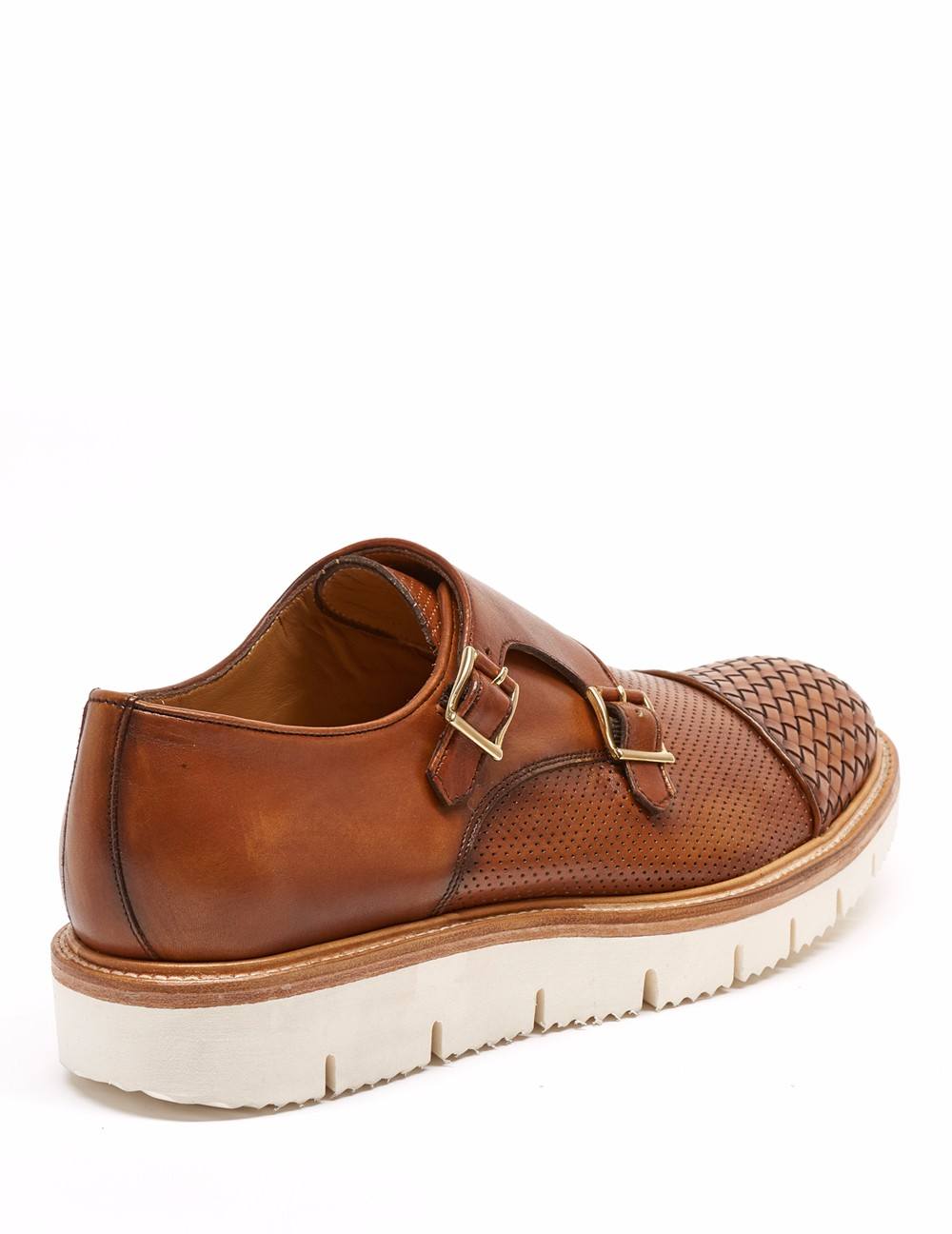 Monk en acabado napa. Detalle de doble hebilla con difuminado en costuras, picado luigi en pala y piel tejida en puntera, cerco natural. Suela Eva tipo flatform.