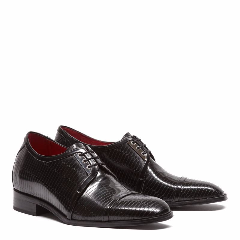 Blucher en acabado antique negro con detalle de grabado láser geométrico y placa en carrillera. Fornituras en plateado. Suela con cuña interior +5 cm.