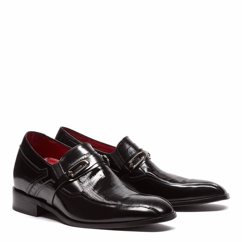 Cerrado en acabado napa, con detalle grabado en pala y talonera, así como herrajes en pala. Fornituras en plateado con cuña interior +5 cm.