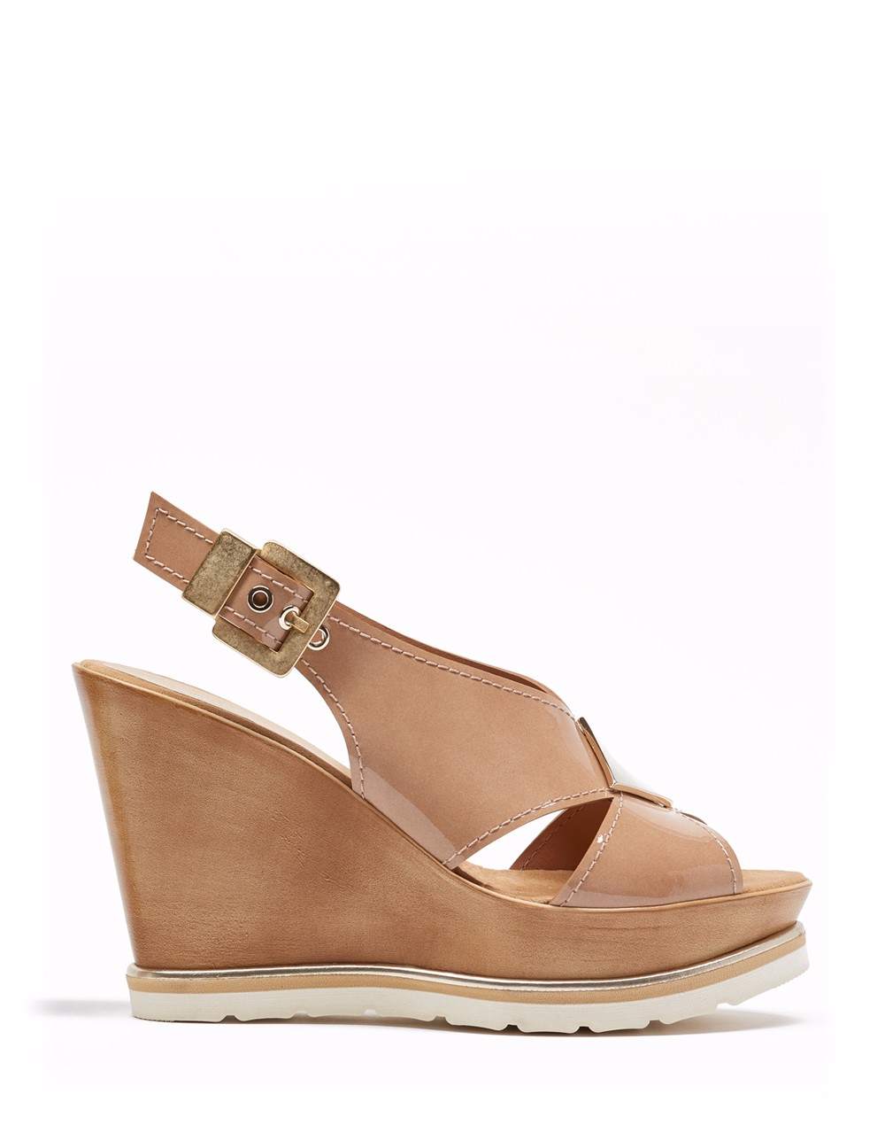 Sandalia en acabado charol. Detalle de pala en corte "X", adorno metálico en pala, con pulsera en talón que facilita el calce. Herrajes y fornituras en oro viejo mate. Plataforma tipo cuña de 9 cm, en acabado natural con flatform en la suela.