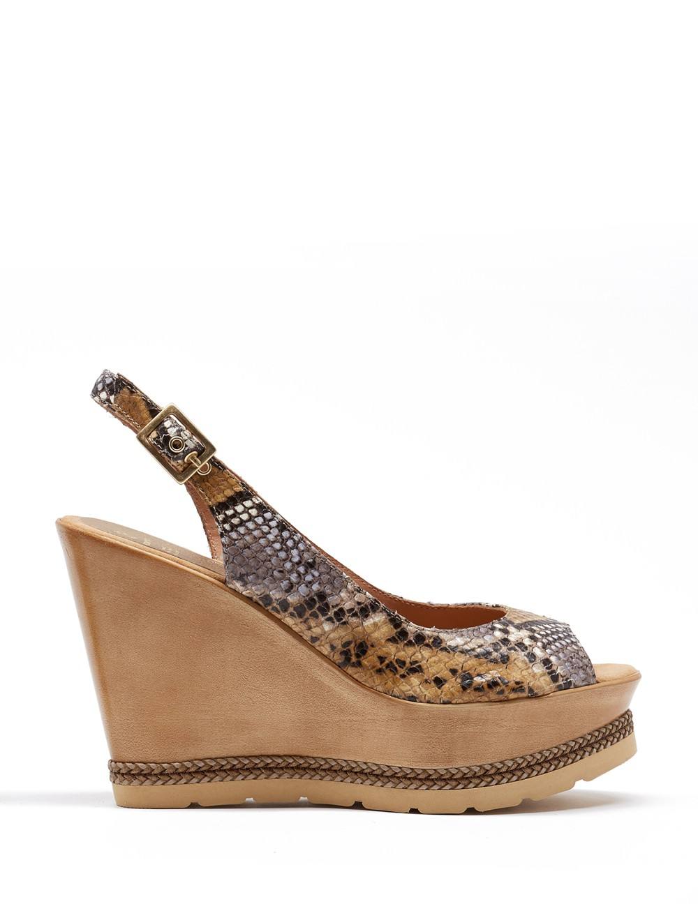 Peep toe destalonado en acabado grabado serpiente. Detalle de grabado serpiente en varios colores pastel. Plataforma cuña de 10 cm en acabado natural con cerco de treza.