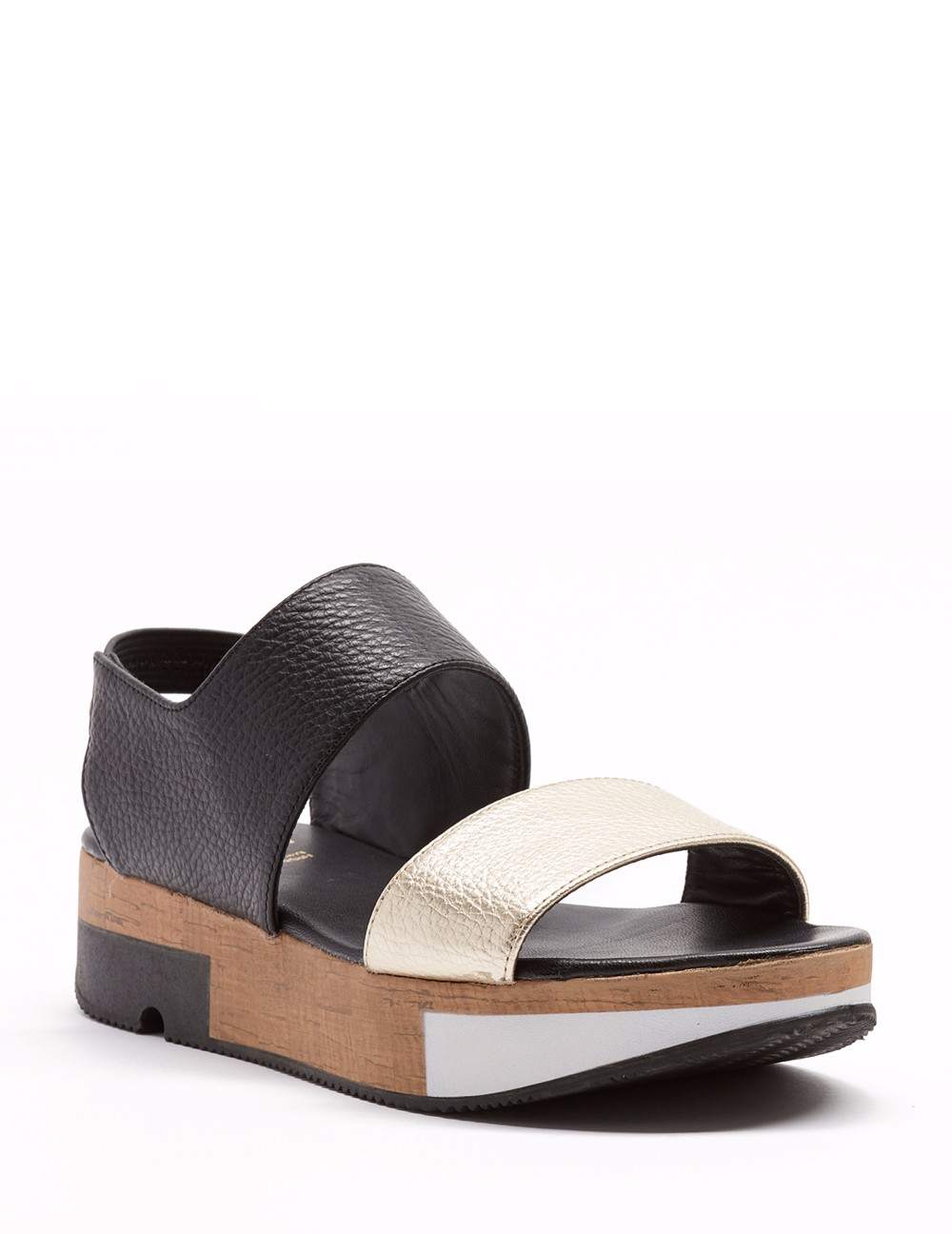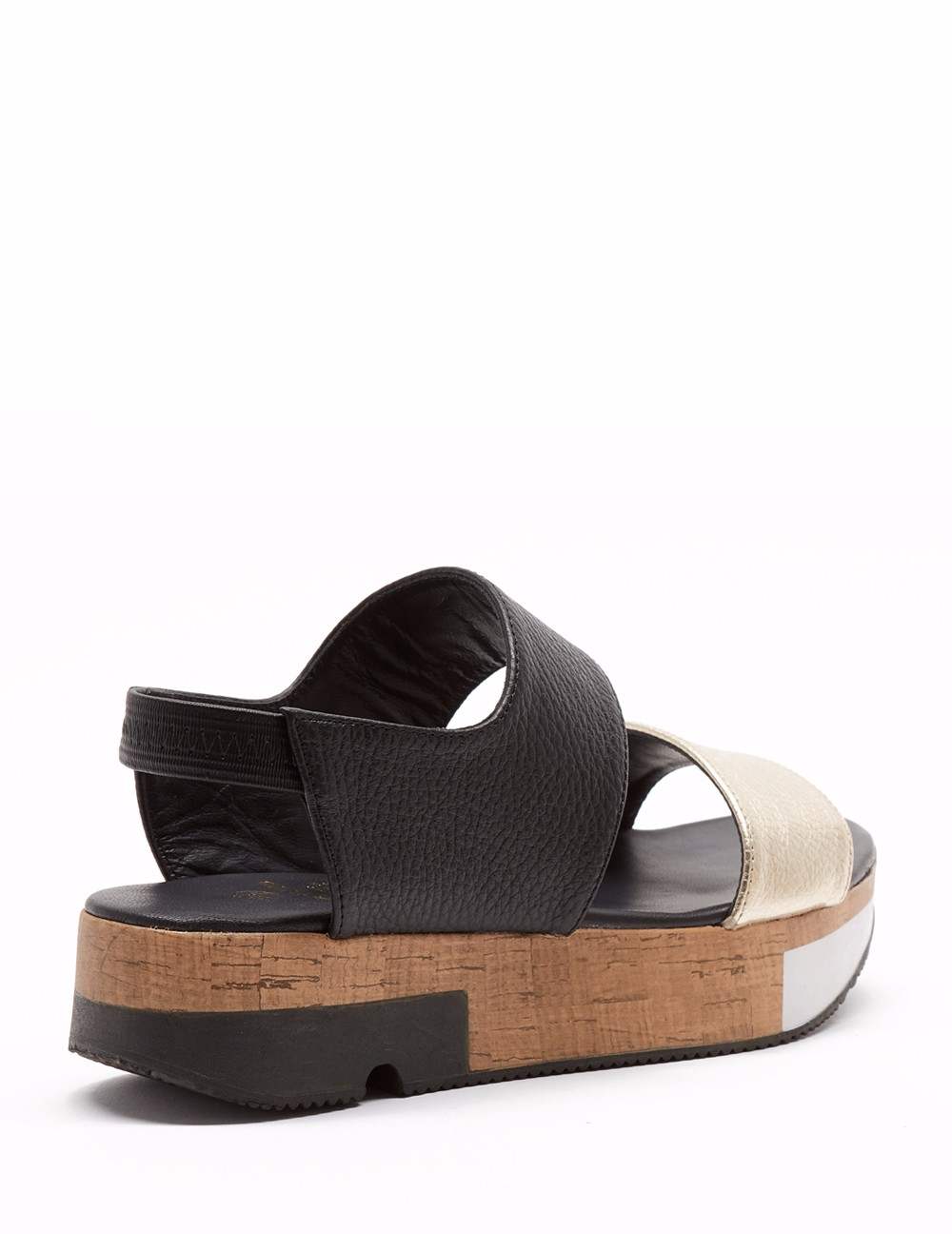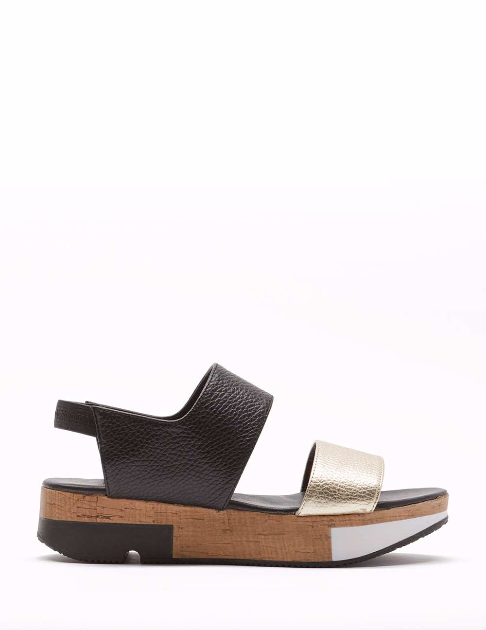 Sandalia en acabado piel graneada. Detalle de pala en piel graneado metálico, elástico en talón que facilita el calce. Plataforma de 3.5 cm en acabado mixto con natural.