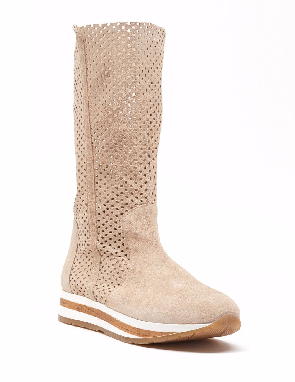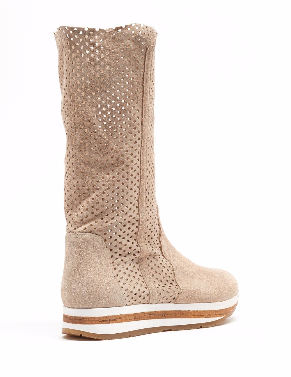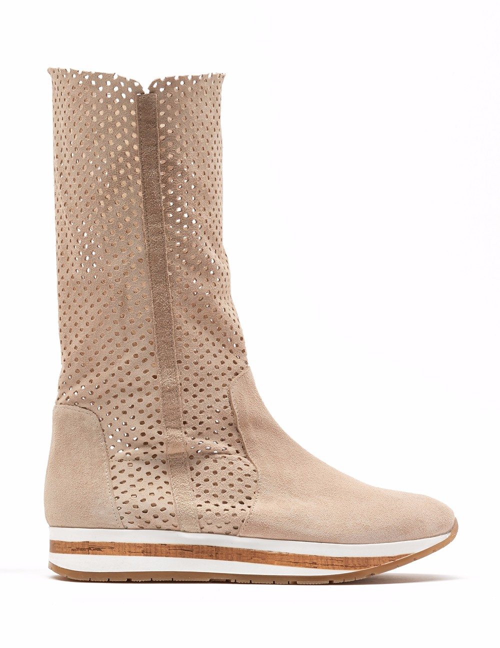 Bota de verano en acabado ante. Detalle de ante troquelado en cañas, cremallera en caña que facilitan el calce. Plataforma de 3 cm en acabado natural combinado con blanco.
