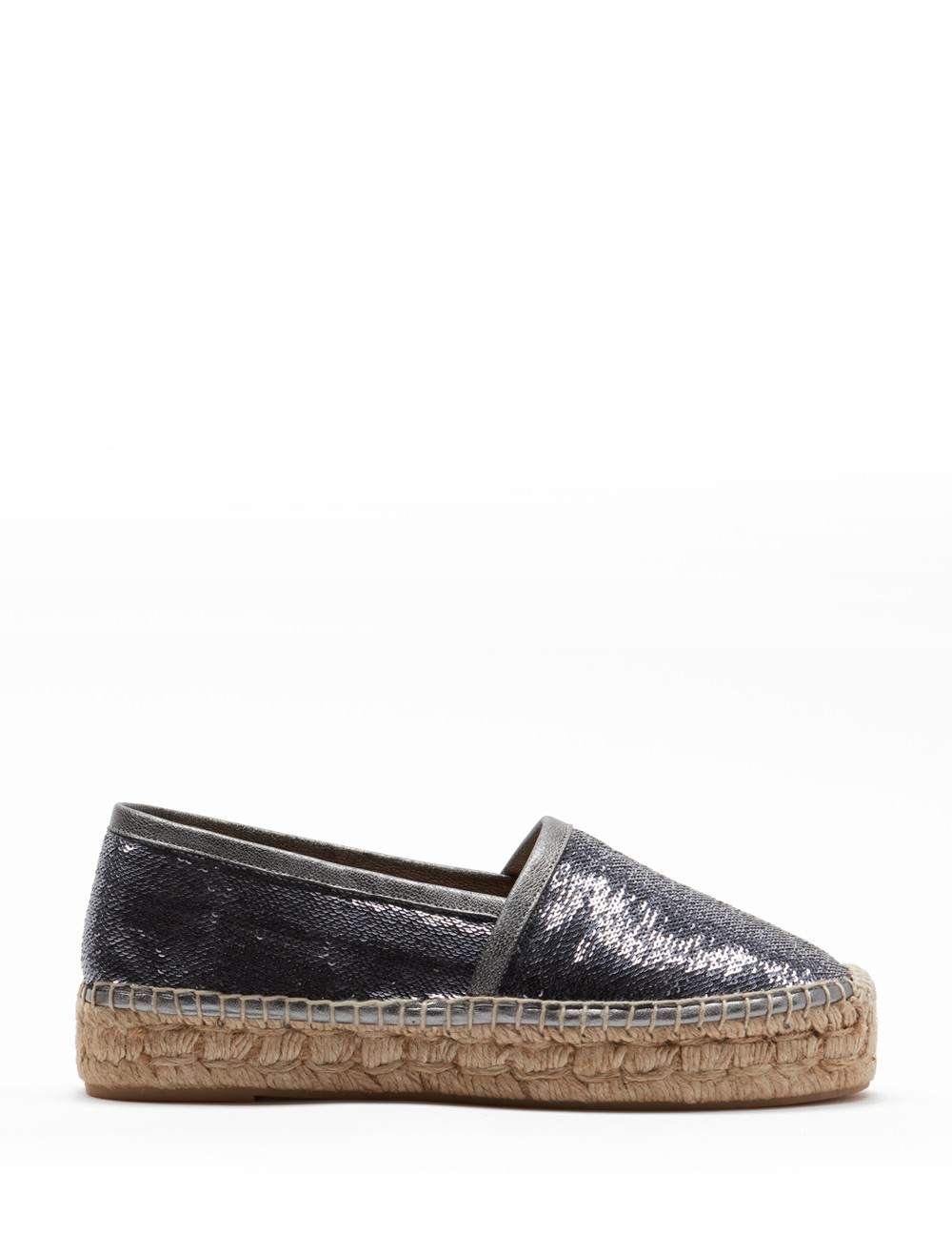 Cerrado en acabado fantasía. Detalle de mini lentejuelas en pala y cañas con ribetes metálicos. Suela de goma y lateral en yute.