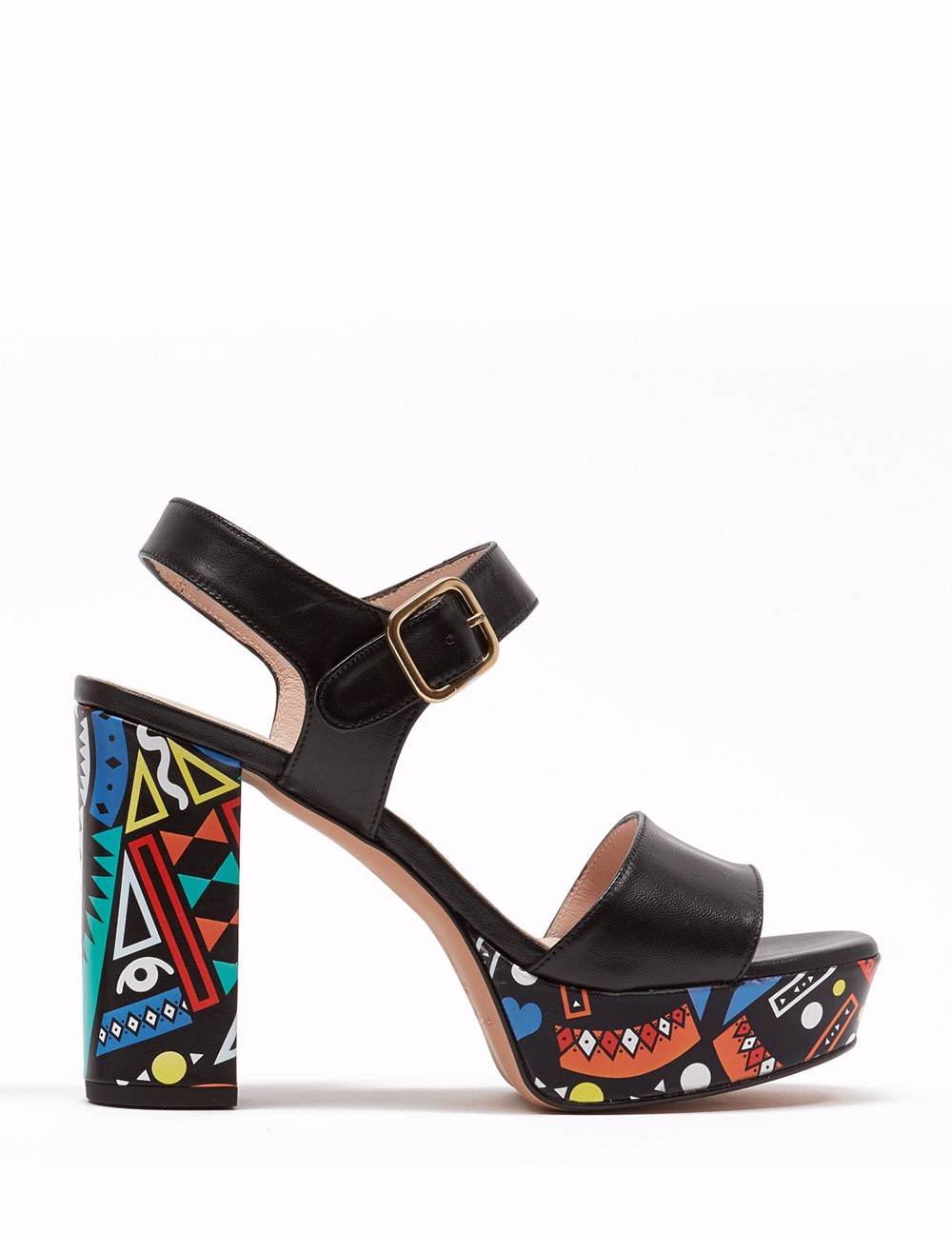 Sandalia en acabado napa. Detalle de pulsera al tobillo que facilita el calce. Herrajes en dorado. Tacón cuadro de 9.5 cm y plataforma de 2.5 cm forrado en arte cubano.