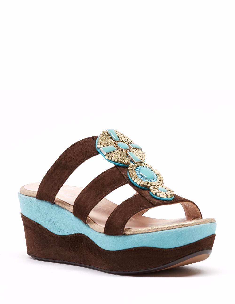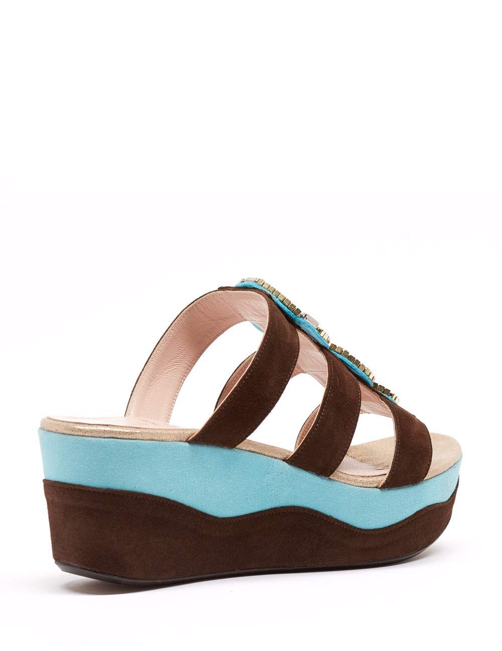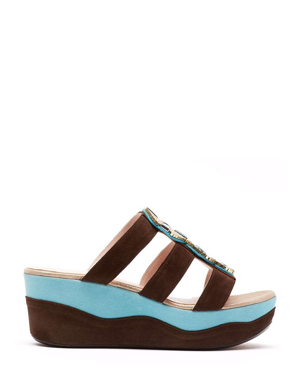 Mule en acabado ante. Detalle de adorno en pala con 3 círculos y cortes láser. Fornituras en color plomo. Plataforma de 6 cm forrada en ante y dos colores.