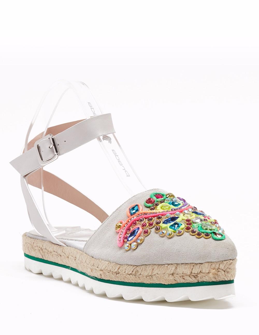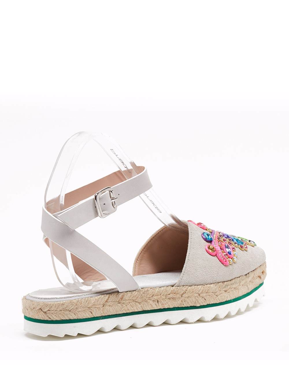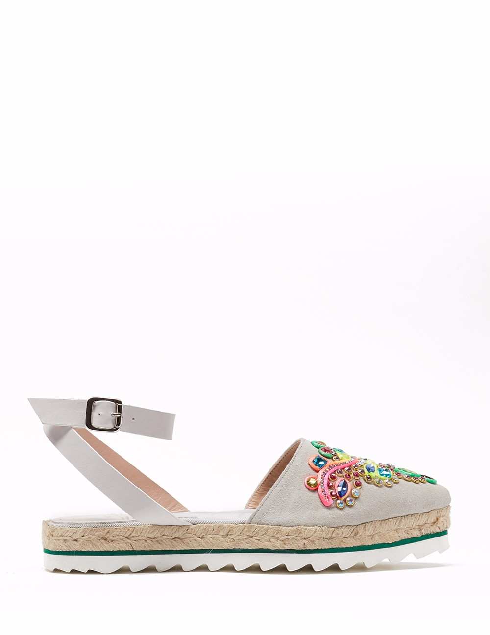 Abierto en acabado ante. Detalle de punta almendrada con adorna de piedras y bordados, pulsera en vaqueta al tobillo que facilita el calce y cerco en trenzado natural. Suela tipo flatform.