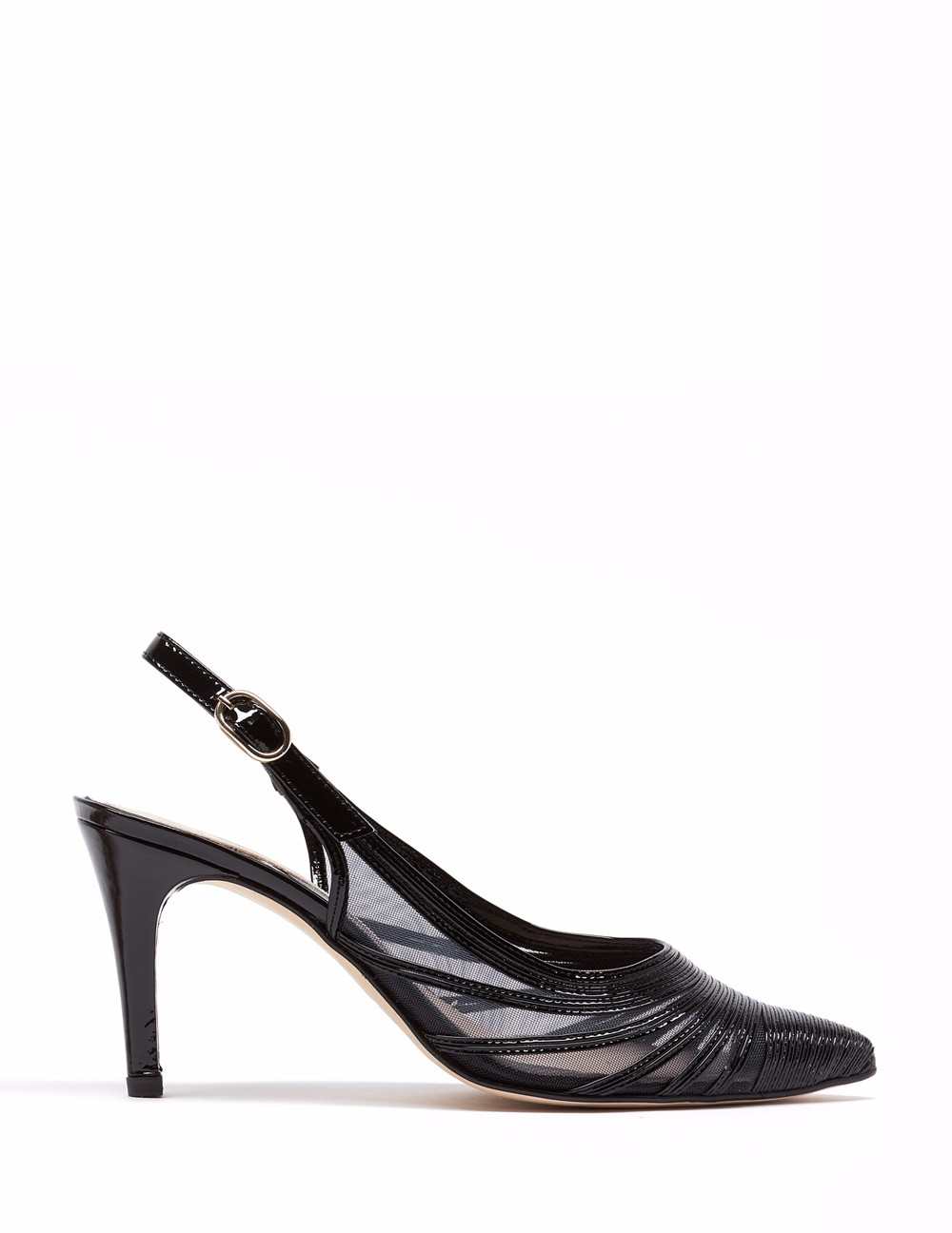 Destalonado en acabado charol. Detalles de ribetes de charol sobre una malla sutil, pulsera en talón que facilita el calce. Herrajes en plateado. Tacón forrado de 7.5 cm.